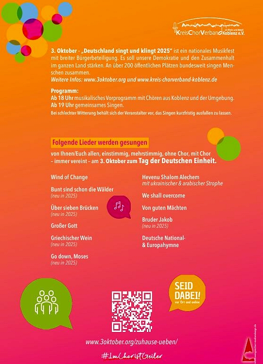 Am deutschen Nationalfeiertag werden Menschen an mehr als 200 öffentlichen Plätzen in der gesamten Bundesrepublik gemeinsam singen. Koblenz wird nach dem Erfolg in den vergangenen Jahren auch 2025 wieder mit dabei sein – auf Initiative des Kreis-Chorverbands Koblenz.